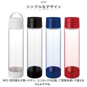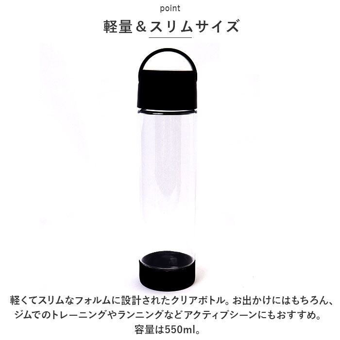 ・軽くてスリムなフォルムに設計されたクリアボトル。お出かけにはもちろん、ジムでのトレーニングやランニングなどアクティブシーンにもおすすめ。容量は550ml。