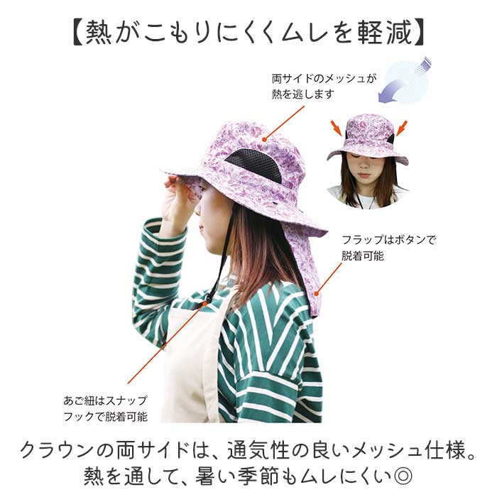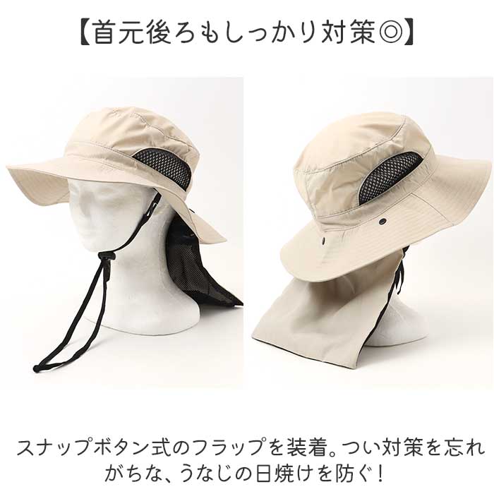 ・スナップボタン式のフラップを装着。つい対策を忘れがちな、うなじの日焼けを防ぐ!