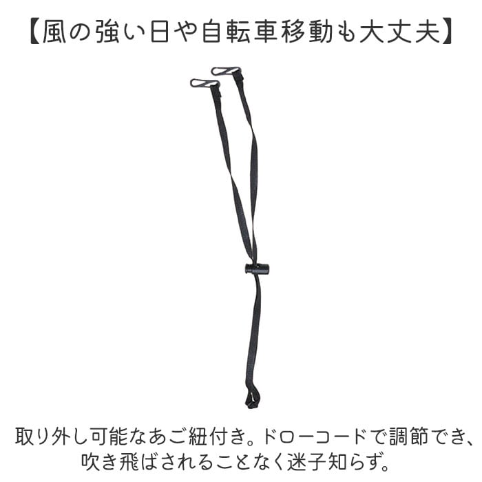 ・取り外し可能なあご紐付き。ドローコードで調節でき、吹き飛ばされることなく迷子知らず。