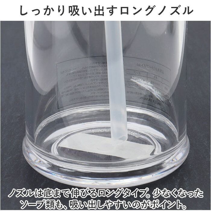 ・ノズルは底まで伸びるロングタイプ。少なくなったソープ類も、吸い出しやすいのがポイント。