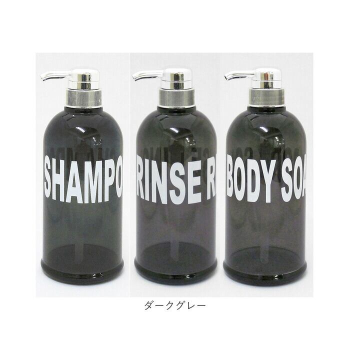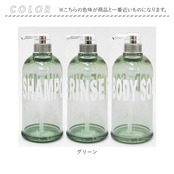 ・デザインは「シャンプー」「リンス」「ボディソープ」の3種類。カラーは「グリーン」「ダークグレー」「クリア」の3カラー。カラーを統一するだけで、ワンランク上の空間を演出♪