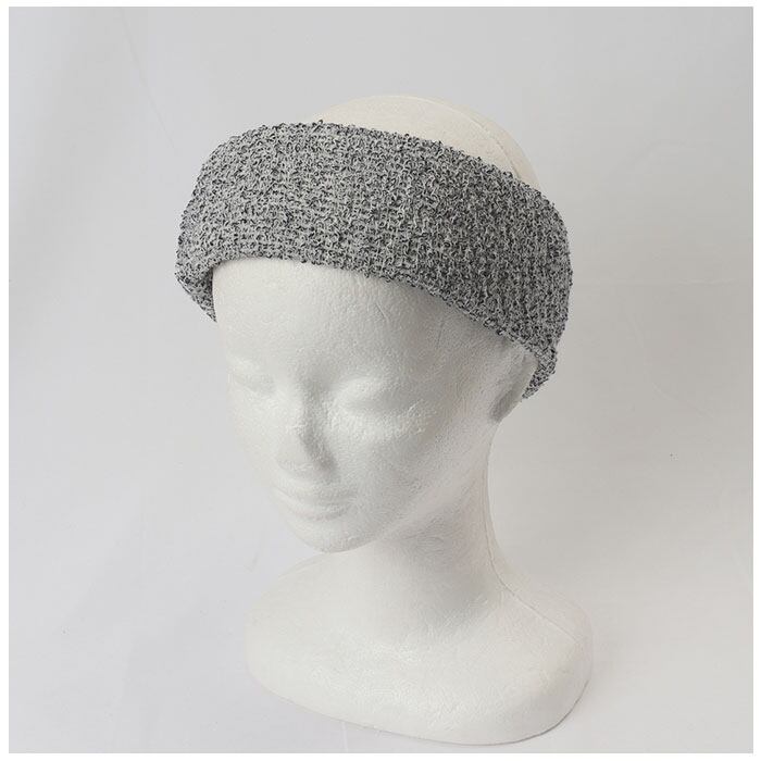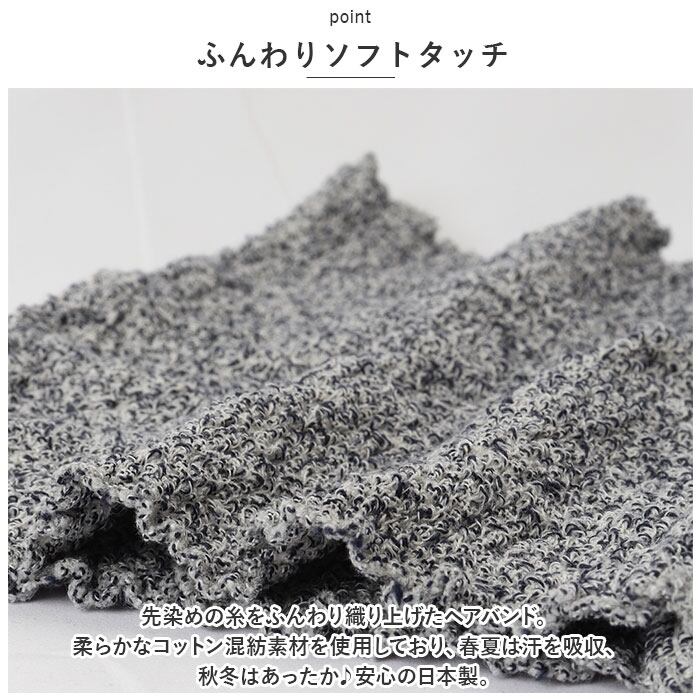 ・先染めの糸をふんわり織り上げたヘアバンド。柔らかなコットン混紡素材を使用しており、春夏は汗を吸収、秋冬はあったか♪安心の日本製。