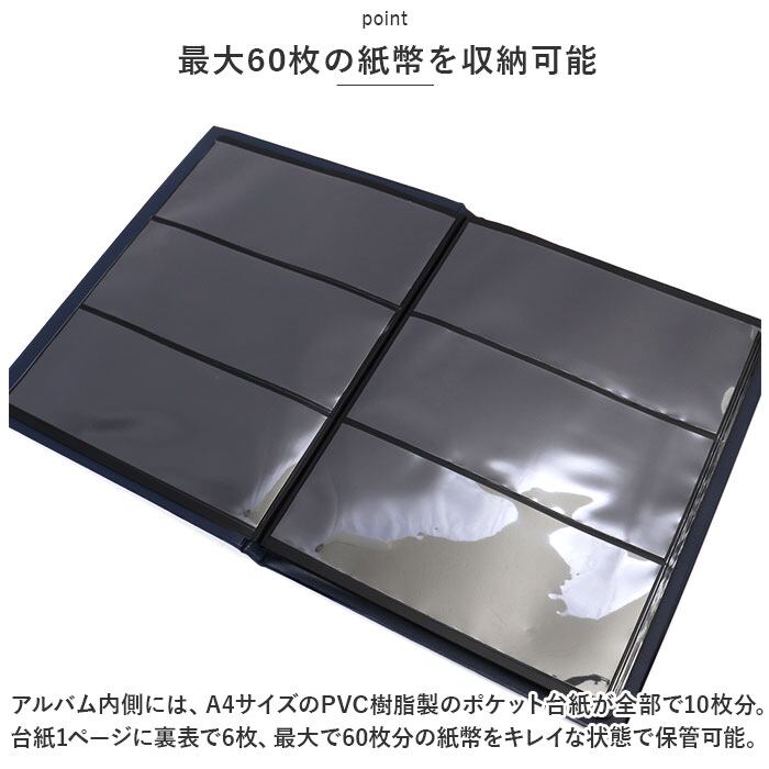 ・アルバム内側には、A4サイズのPVC樹脂製のポケット台紙が全部で10枚分。台紙1ページに裏表で6枚、最大で60枚分の紙幣をキレイな状態で保管可能。