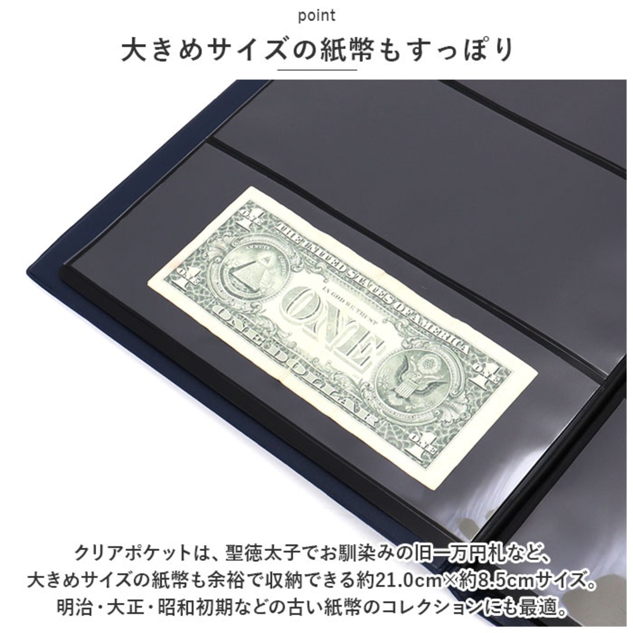 ・クリアポケットは、聖徳太子でお馴染みの旧一万円札など、大きめサイズの紙幣も余裕で収納できる約21.0cm×約8.5cmサイズ。明治・大正・昭和初期などの古い紙幣のコレクションにも最適。
