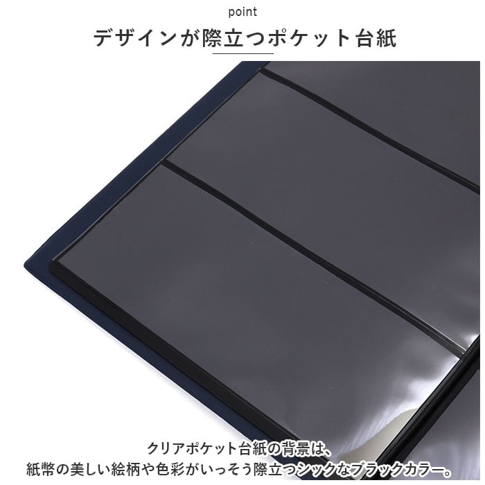 ・クリアポケット台紙の背景は、紙幣の美しい絵柄や色彩がいっそう際立つシックなブラックカラー。