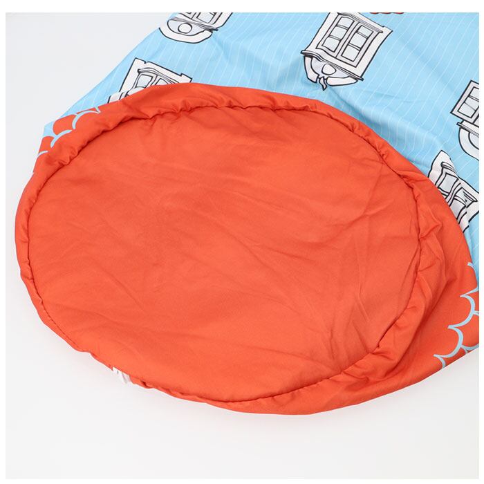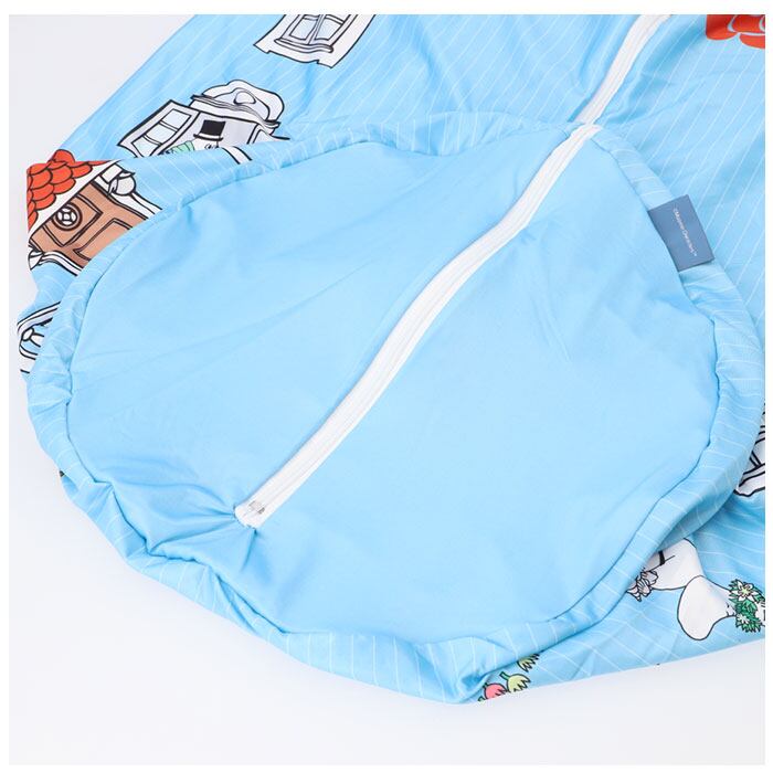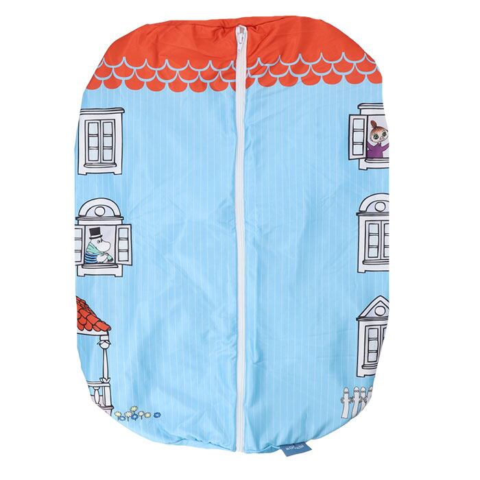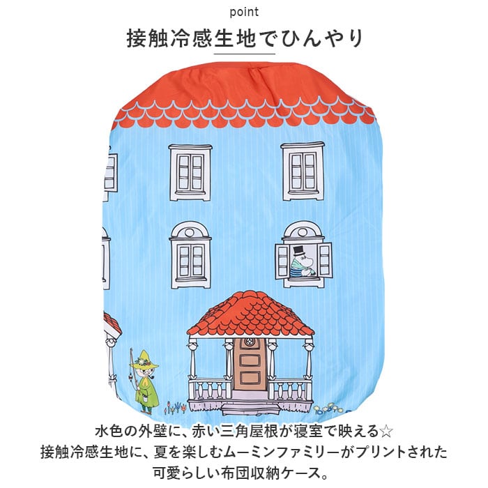 ・水色の外壁に、赤い三角屋根が寝室で映える☆接触冷感生地に、夏を楽しむムーミンファミリーがプリントされた可愛らしい布団収納ケース。
