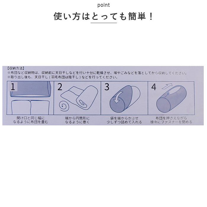 ・シングルサイズの掛け布団が1枚すっぽりと入るサイズ感。シーズンオフで使わない掛け布団をギュッと丸めて収納可能。