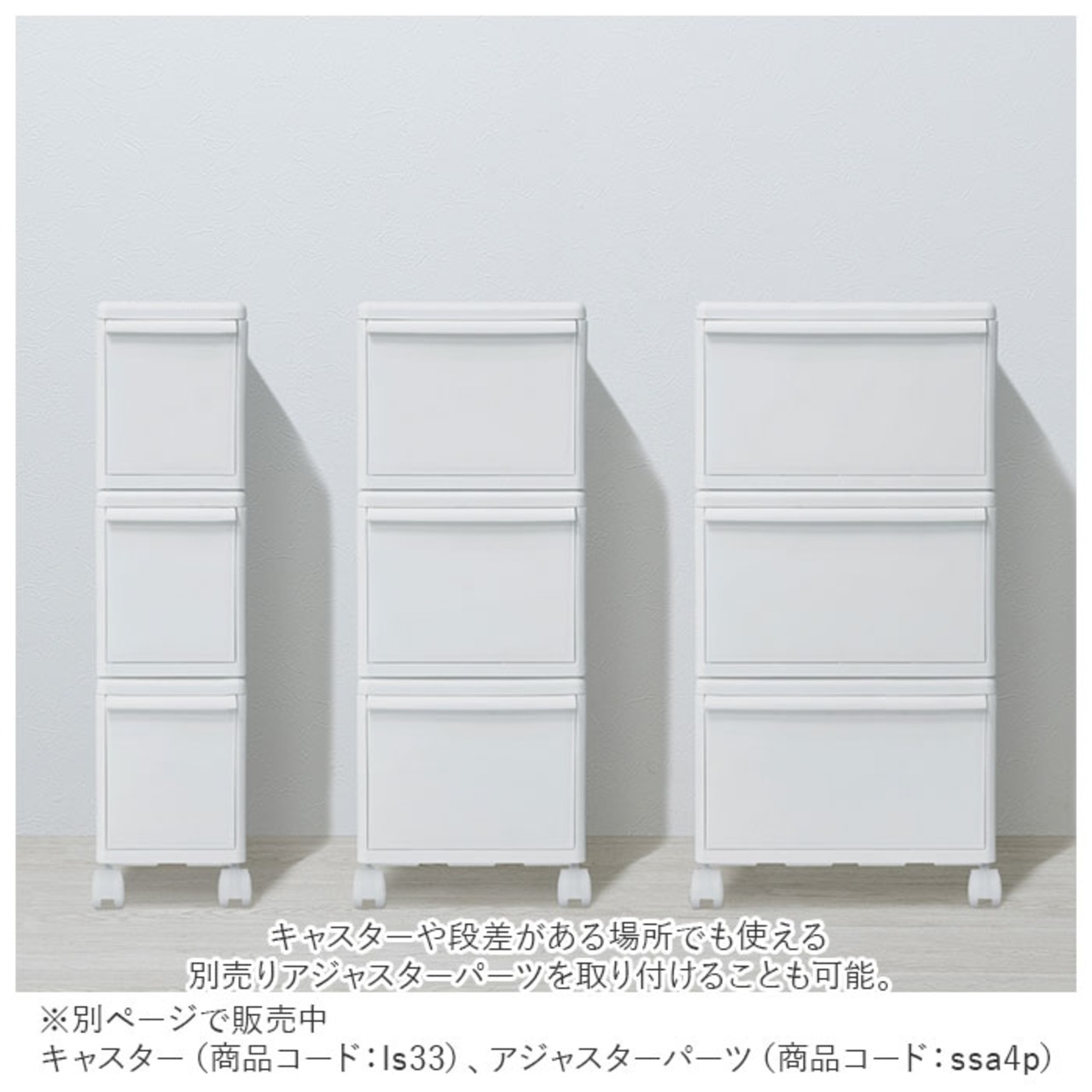 ・さらにキャスターや段差がある場所でも使える別売りアジャスターパーツを取り付けることも可能。【※こちらのページは衣装ケース「ミディM」のみの販売です。キャスター(商品コード:ls33)、アジャスターパーツ(商品コード:ssa4p)は別ページでご購入ください。】