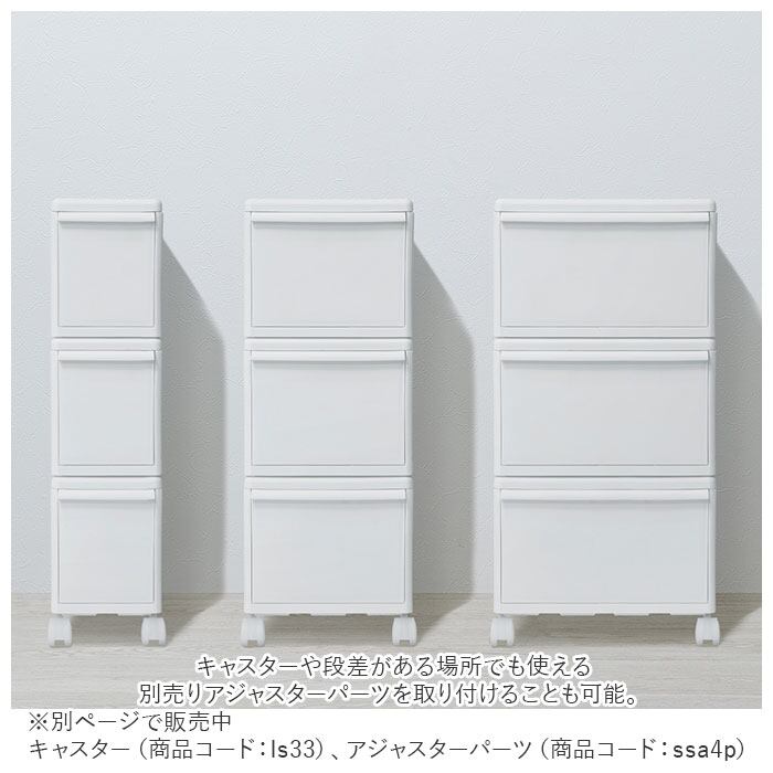 ・さらにキャスターや段差がある場所でも使える別売りアジャスターパーツを取り付けることも可能。【※こちらのページは衣装ケース「スリムL」のみの販売です。キャスター(商品コード:ls33)、アジャスターパーツ(商品コード:ssa4p)は別ページでご購入ください。】