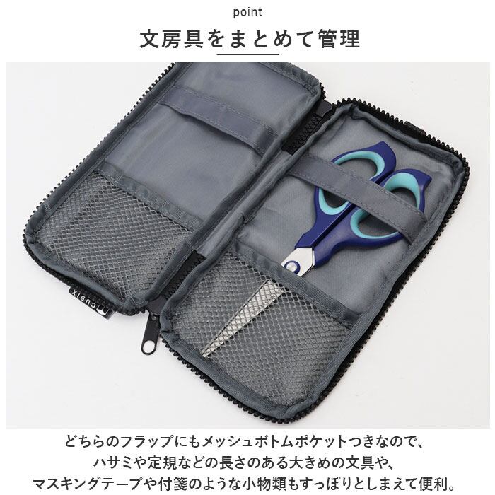 ・どちらのフラップにもメッシュボトムポケットつきなので、ハサミや定規などの長さのある大きめの文具や、マスキングテープや付箋のような小物類もすっぽりとしまえて便利。