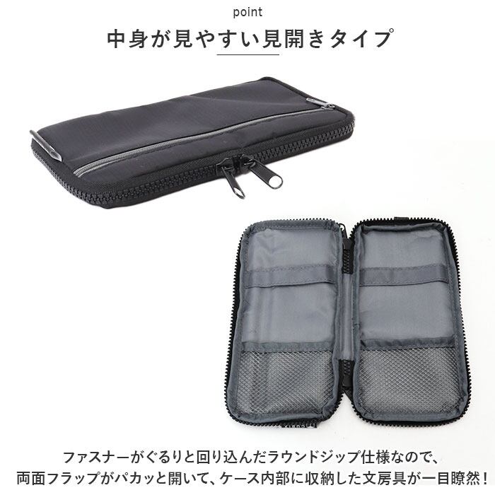 ・ファスナーがぐるりと回り込んだラウンドジップ仕様なので、両面フラップがパカッと開いて、ケース内部に収納した文房具が一目瞭然!