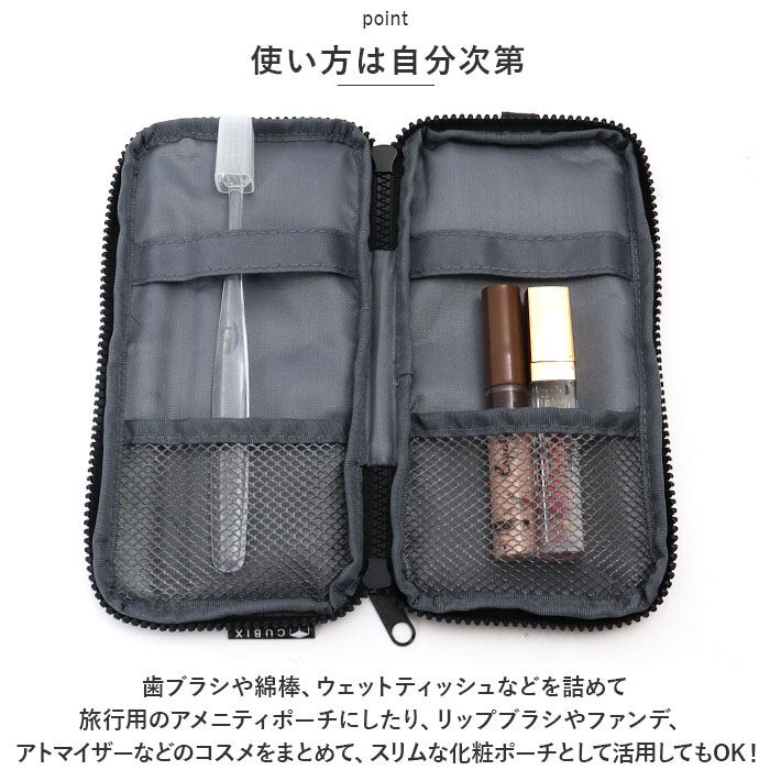 ・歯ブラシや綿棒、ウェットティッシュなどを詰めて旅行用のアメニティポーチにしたり、リップブラシやファンデ、アトマイザーなどのコスメをまとめて、スリムな化粧ポーチとして活用してもOK!