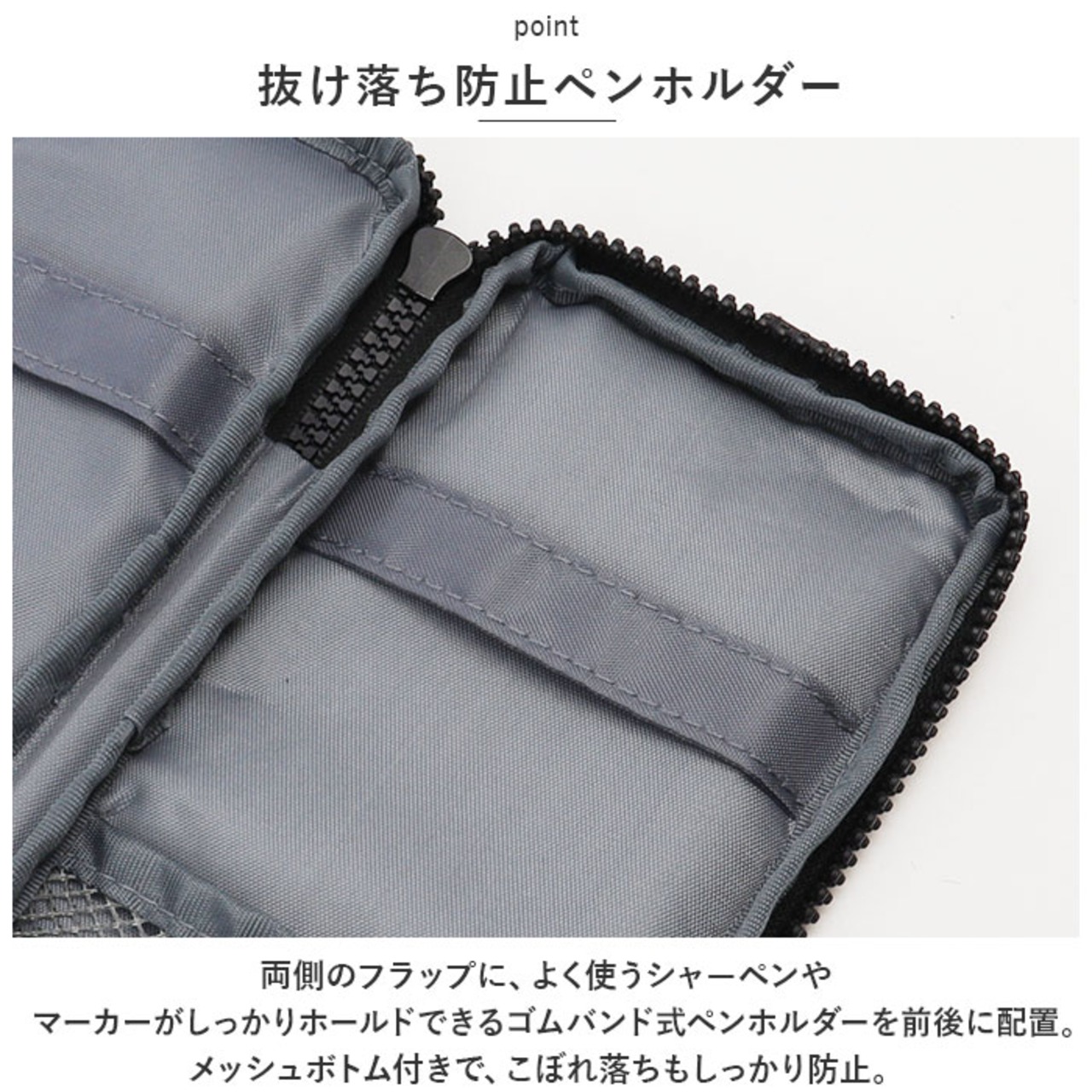 ・両側のフラップに、よく使うシャーペンやマーカーがしっかりホールドできるゴムバンド式ペンホルダーを前後に配置。メッシュボトム付きで、こぼれ落ちもしっかり防止。
