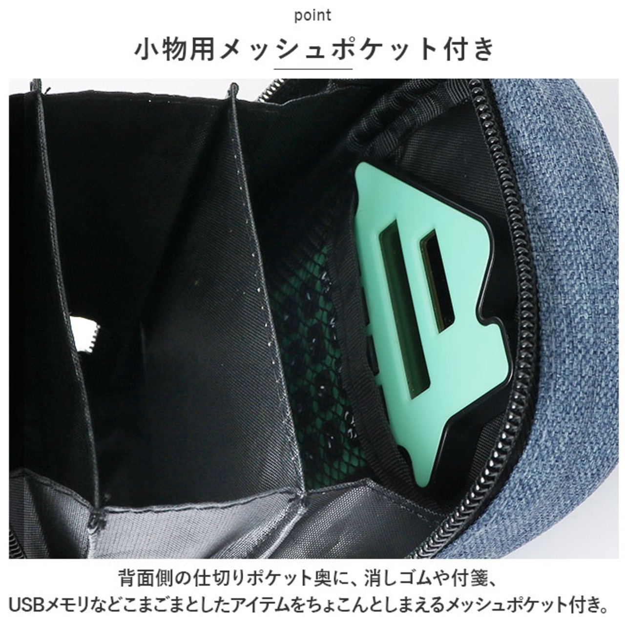 ・背面側の仕切りポケット奥に、消しゴムや付箋、USBメモリなどこまごまとしたアイテムをちょこんとしまえるメッシュポケット付き。