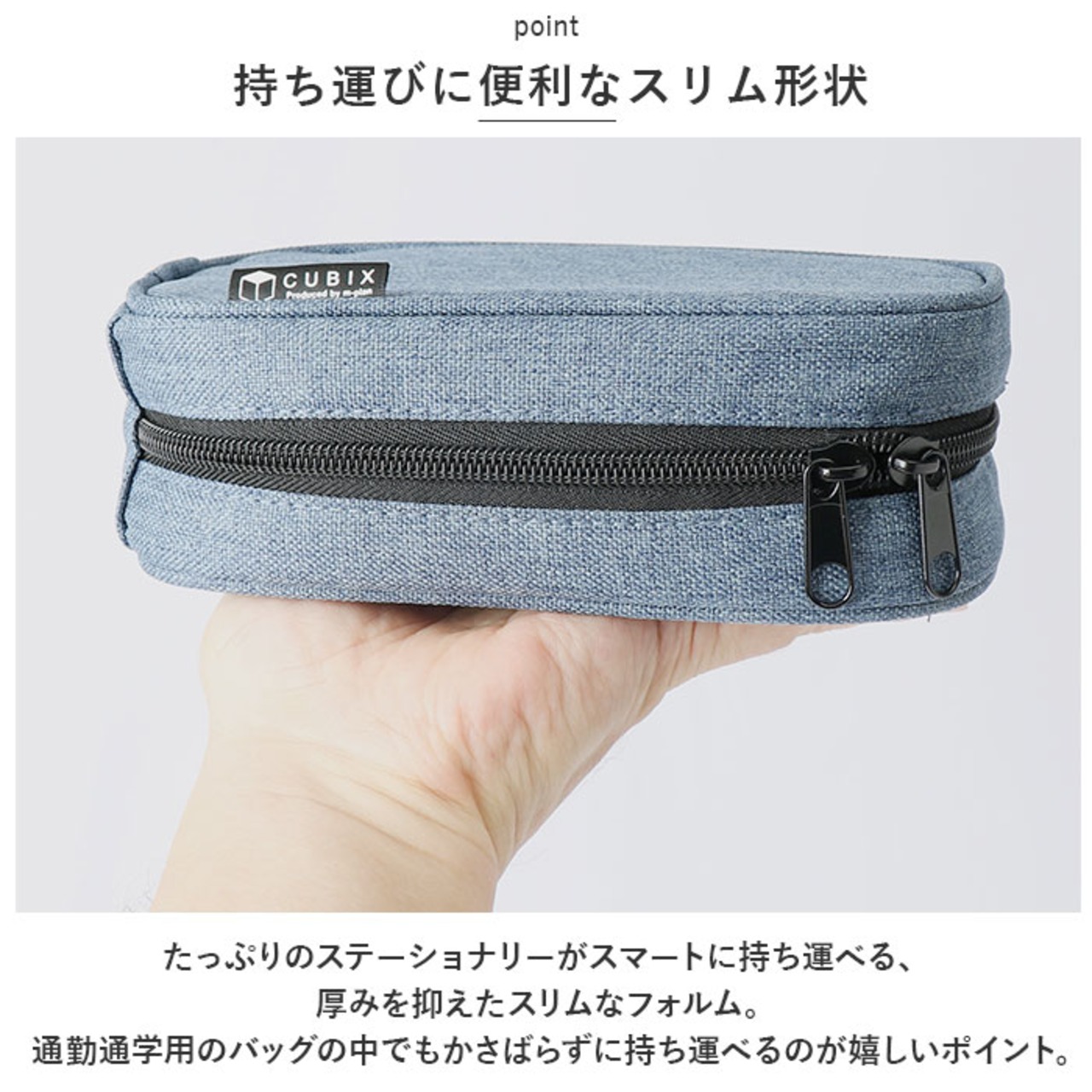 ・たっぷりのステーショナリーがスマートに持ち運べる、厚みを抑えたスリムなフォルム。通勤通学用のバッグの中でもかさばらずに持ち運べるのが嬉しいポイント。