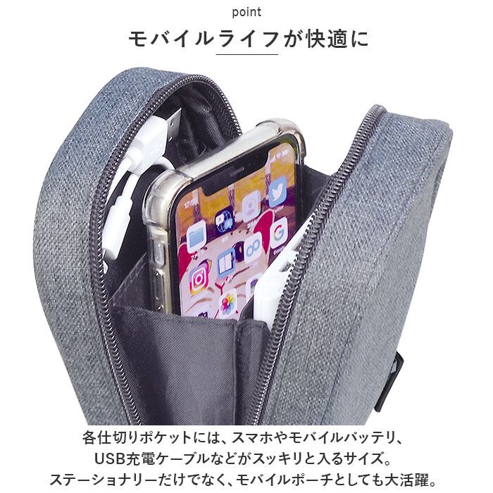 ・各仕切りポケットには、スマホやモバイルバッテリ、USB充電ケーブルなどがスッキリと入るサイズ。ステーショナリーだけでなく、モバイルポーチとしても大活躍。