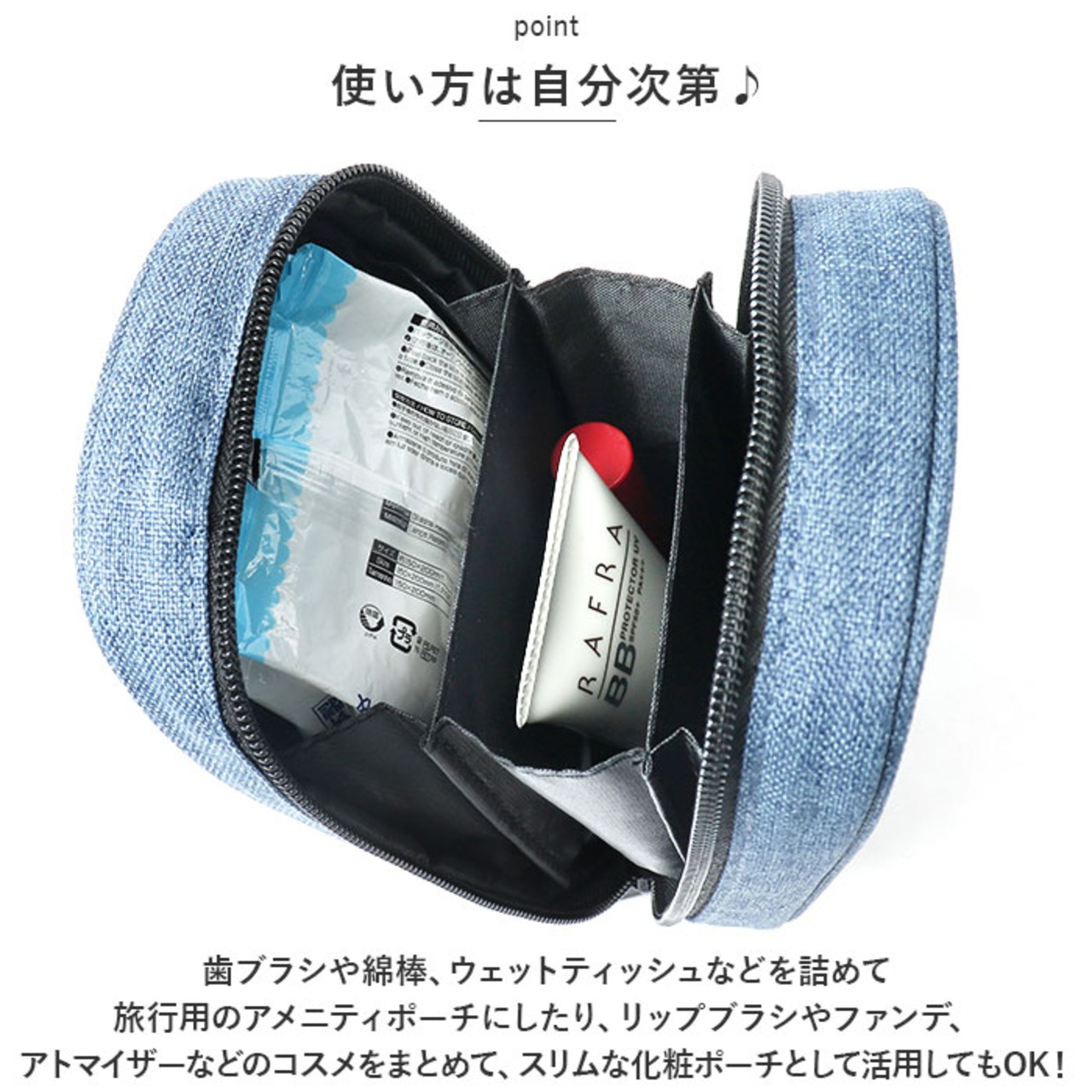 ・歯ブラシや綿棒、ウェットティッシュなどを詰めて旅行用のアメニティポーチにしたり、リップブラシやファンデ、アトマイザーなどのコスメをまとめて、スリムな化粧ポーチとして活用してもOK!