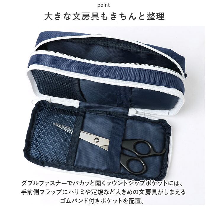 ・ダブルファスナーでパカッと開くラウンドジップポケットには、手前側フラップにハサミや定規など大きめの文房具がしまえるゴムバンド付きポケットを配置。