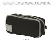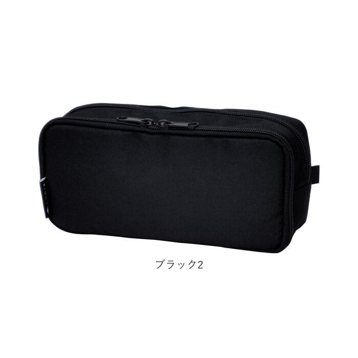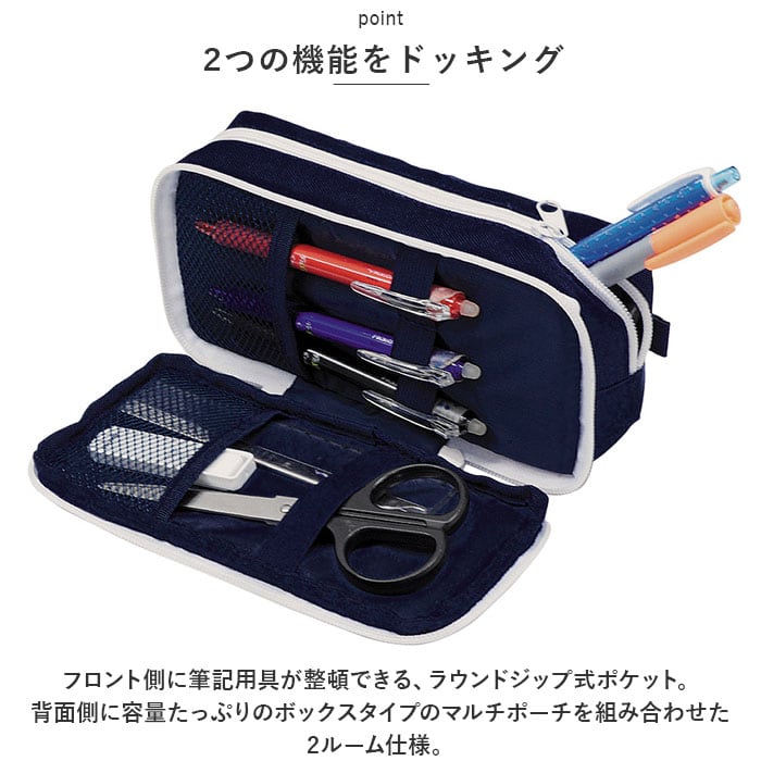 ・フロント側に筆記用具が整頓できる、ラウンドジップ式ポケット。背面側に容量たっぷりのボックスタイプのマルチポーチを組み合わせた2ルーム仕様。