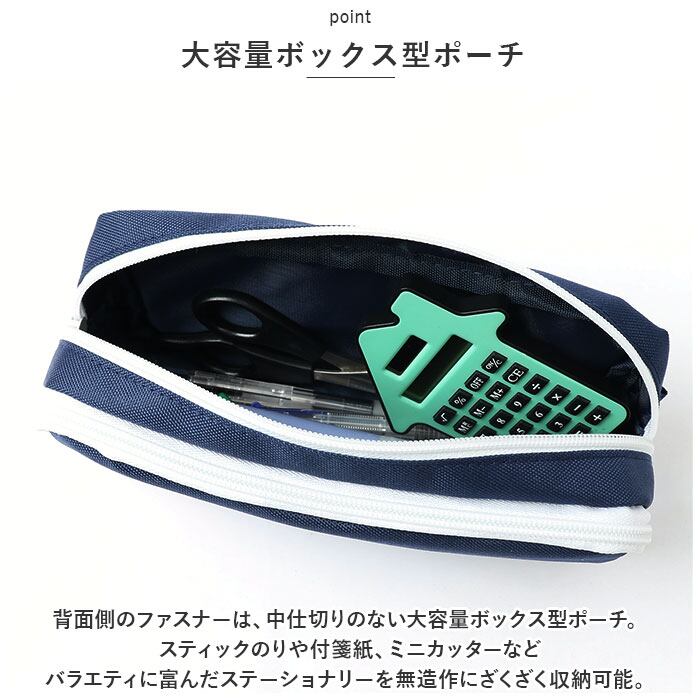 ・背面側のファスナーは、中仕切りのない大容量ボックス型ポーチ。スティックのりや付箋紙、ミニカッターなどバラエティに富んだステーショナリーを無造作にざくざく収納可能。