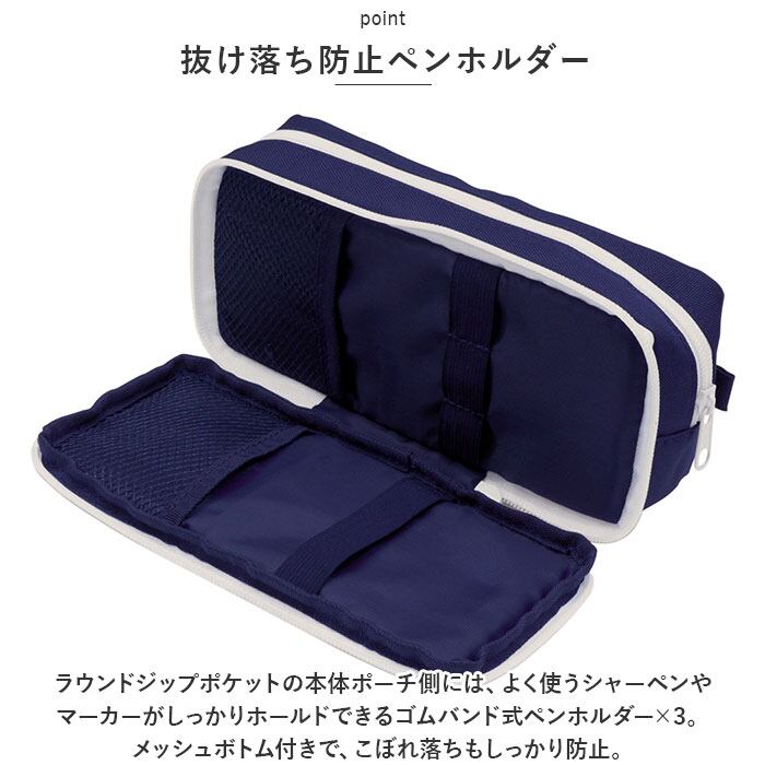 ・ラウンドジップポケットの本体ポーチ側には、よく使うシャーペンやマーカーがしっかりホールドできるゴムバンド式ペンホルダー×3。メッシュボトム付きで、こぼれ落ちもしっかり防止。