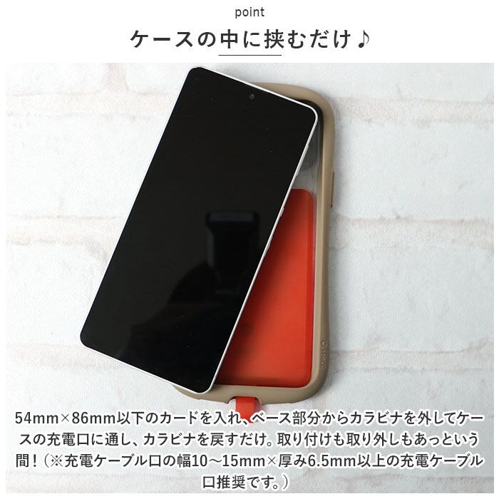 ・54mm×86mm以下のカードを入れ、ベース部分からカラビナを外してケースの充電口に通し、カラビナを戻すだけ。取り付けも取り外しもあっという間!(※充電ケーブル口の幅10~15mm×厚み6.5mm以上の充電ケーブル口推奨です。)