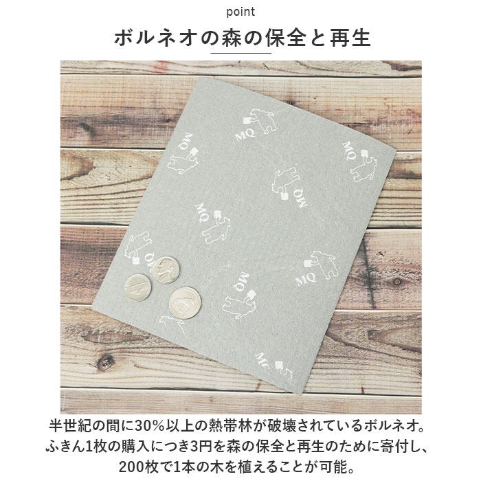 ・半世紀の間に30%以上の熱帯林が破壊されているボルネオ。ふきん1枚の購入につき3円を森の保全と再生のために寄付し、200枚で1本の木を植えることが可能。