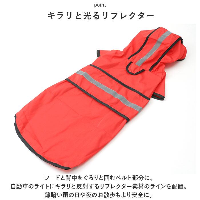 ・フードと背中をぐるりと囲むベルト部分に、自動車のライトにキラリと反射するリフレクター素材のラインを配置。薄暗い雨の日や夜のお散歩もより安全に。