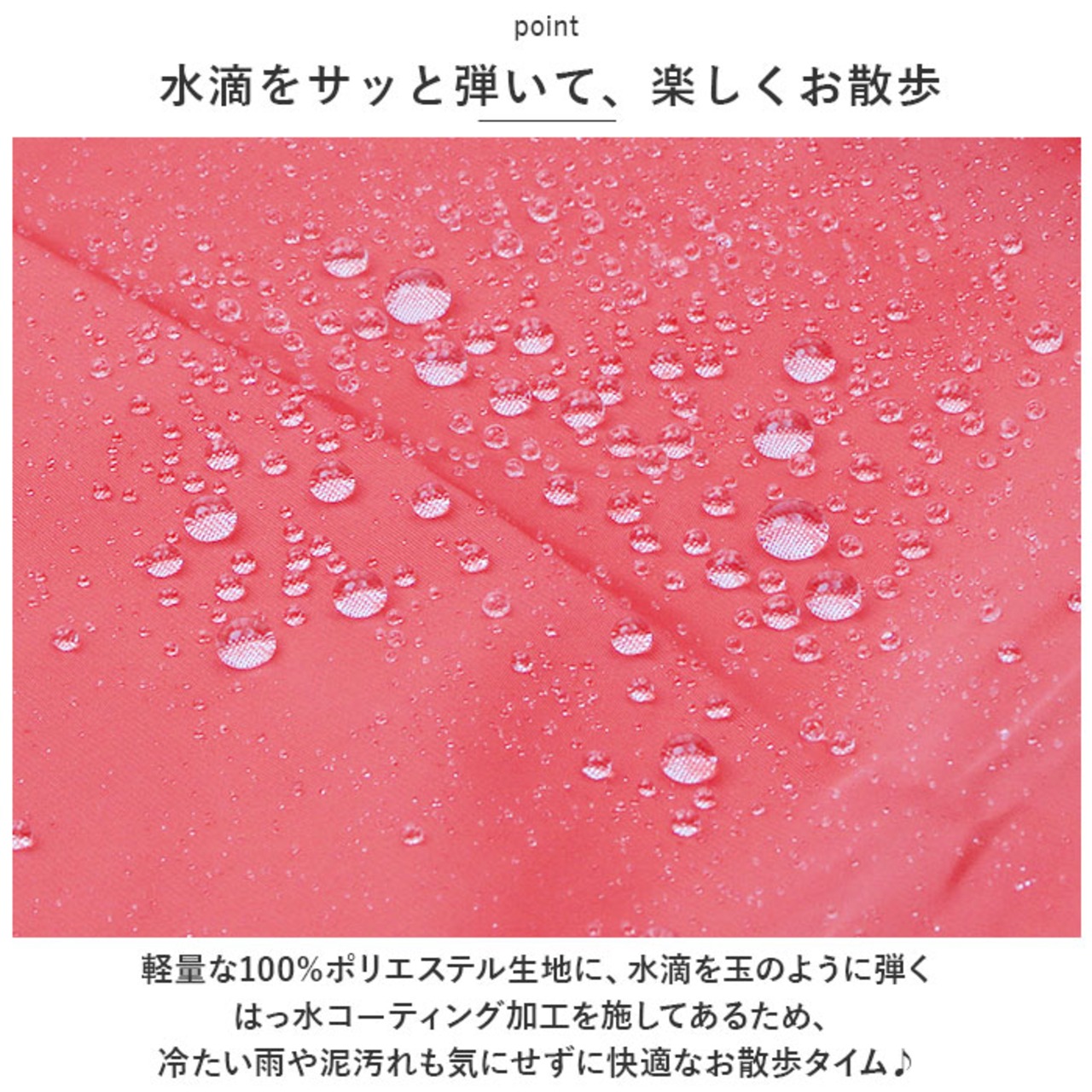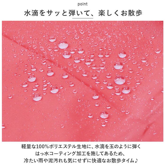 ・軽量な100%ポリエステル生地に、水滴を玉のように弾くはっ水コーティング加工を施してあるため、冷たい雨や泥汚れも気にせずに快適なお散歩タイム♪