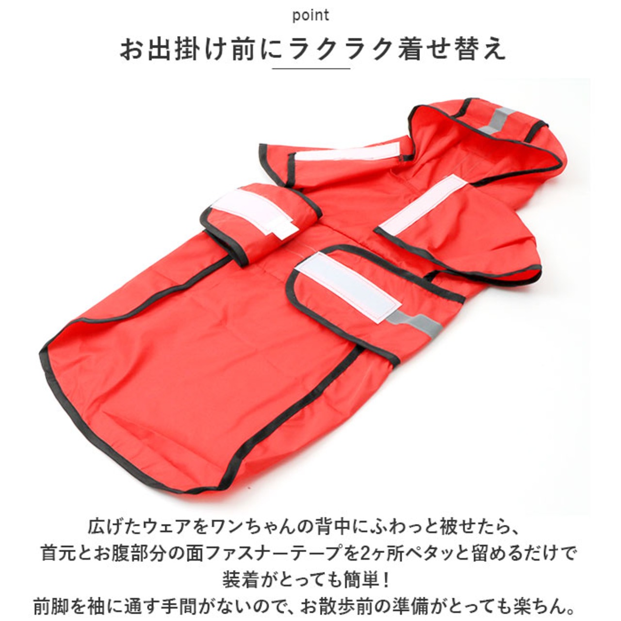 ・広げたウェアをワンちゃんの背中にふわっと被せたら、首元とお腹部分の面ファスナーテープを2ヶ所ペタッと留めるだけで装着がとっても簡単!前脚を袖に通す手間がないので、お散歩前の準備がとっても楽ちん。