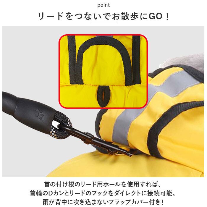 ・首の付け根のリード用ホールを使用すれば、首輪のDカンとリードのフックをダイレクトに接続可能。雨が背中に吹き込まないフラップカバー付き!