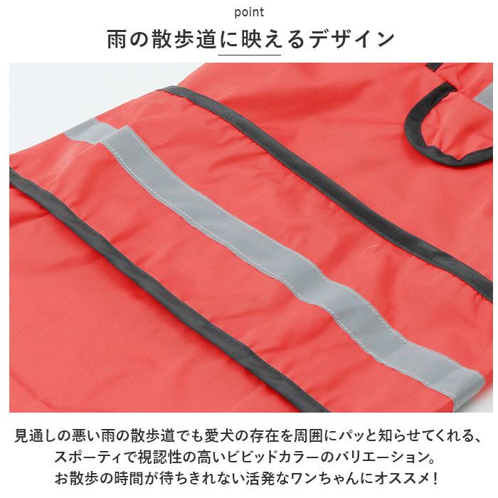 ・見通しの悪い雨の散歩道でも愛犬の存在を周囲にパッと知らせてくれる、スポーティで視認性の高いビビッドカラーのバリエーション。お散歩の時間が待ちきれない活発なワンちゃんにオススメ!