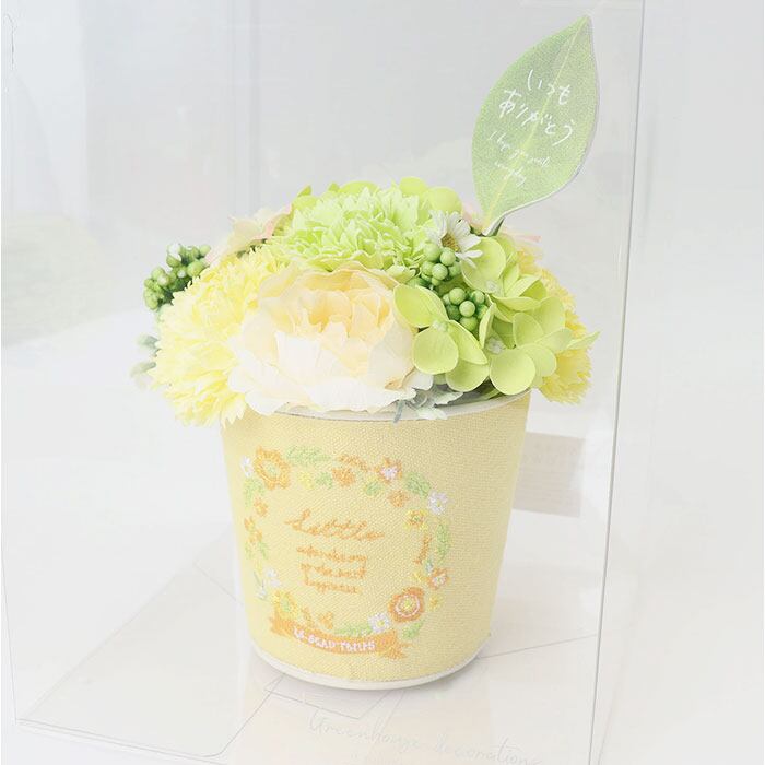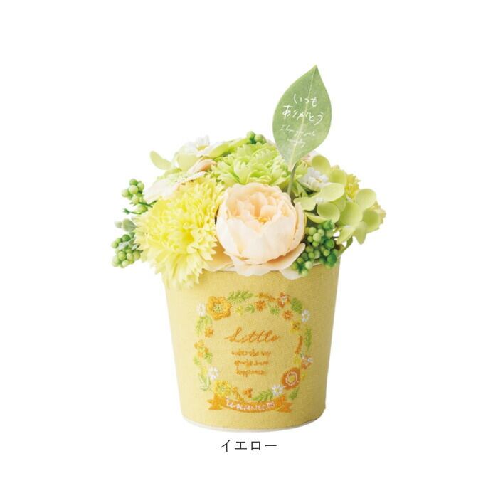 ・繊細な刺繍デザインを施したブリキポット&色とりどりのアーティフィシャルフラワーがマッチ♪