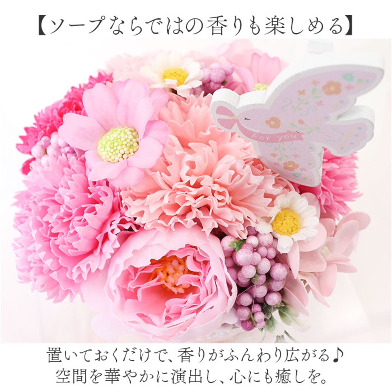 ・造花と石鹸素材から作られた、観賞用フラワーアレンジメント。生花さながらの美しい色合い♪