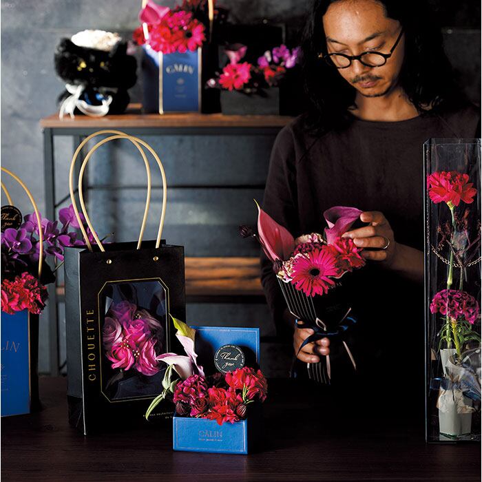 ・アーティフィシャルフラワーをふんだんに使った、「フレームバッグソープフラワーブーケ」。
