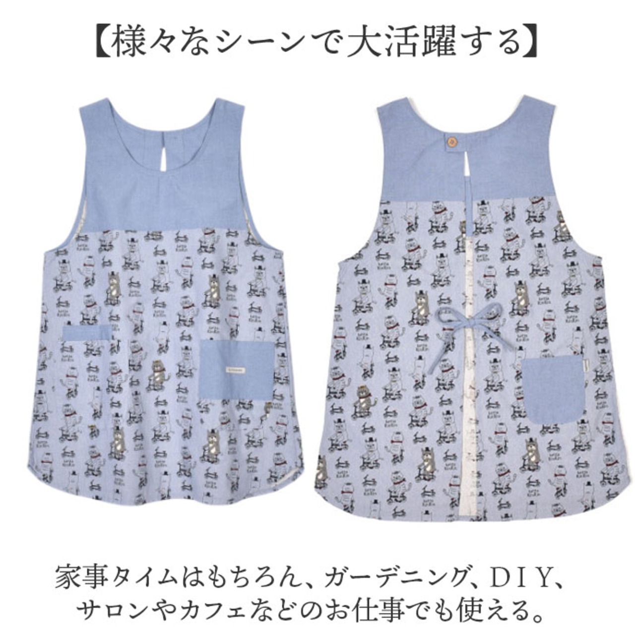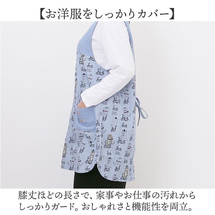 ・膝丈ほどの長さで、家事やお仕事の汚れからしっかりガード。おしゃれさと機能性を両立。