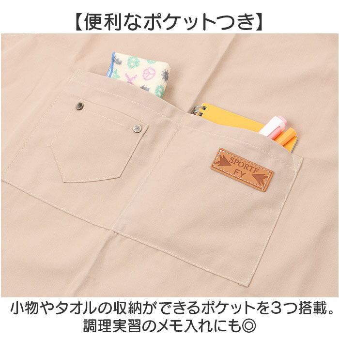 ・小物やタオルの収納ができるポケットを3つ搭載。調理実習のメモ入れにも◎