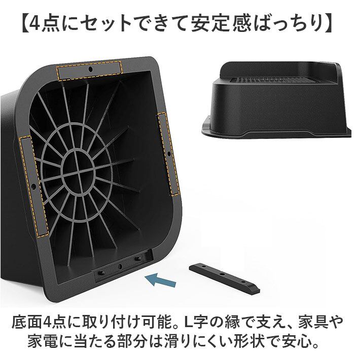・底面4点に取り付け可能。L字の縁で支え、家具や家電に当たる部分は滑りにくい形状で安心。