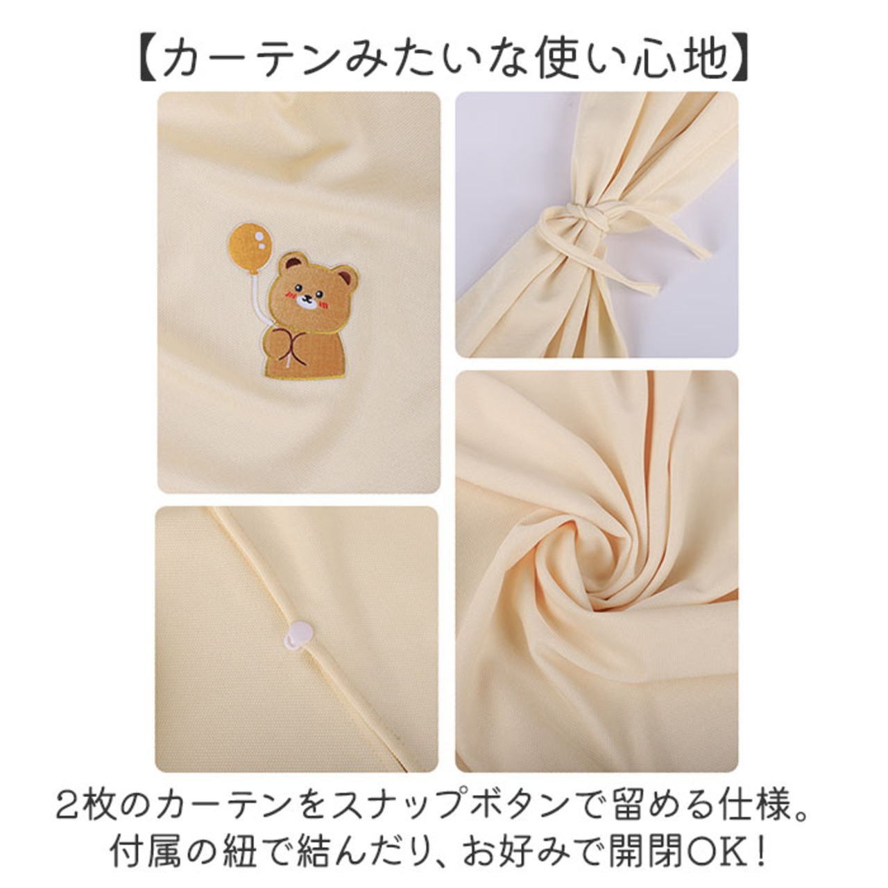 ・2枚のカーテンをスナップボタンで留める仕様。付属の紐で結んだり、お好みで開閉OK!