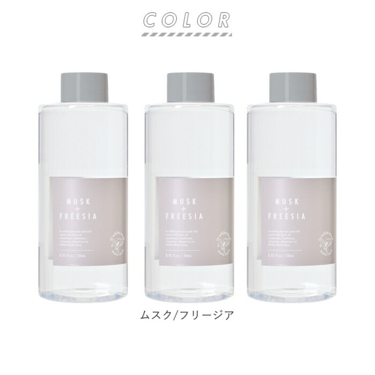 ・ムスク/フリージア・・・ホワイトムスクの優しい調香に、甘さ・爽やかさ・みずみずしさ・落ち着いた上品さをプラスした、バランスのよい奥行のある香り。