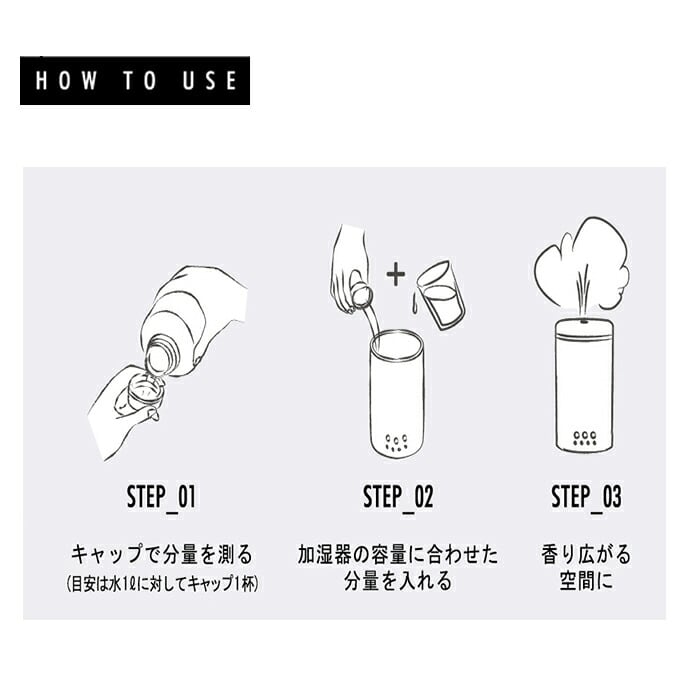 ・加湿器給水タンクに水を張り、水1Lに対して本品キャップ1杯(約4.5ml)の割合で混ぜると、ミストと一緒にふわっと香りが広がり、お部屋が快適空間に◎