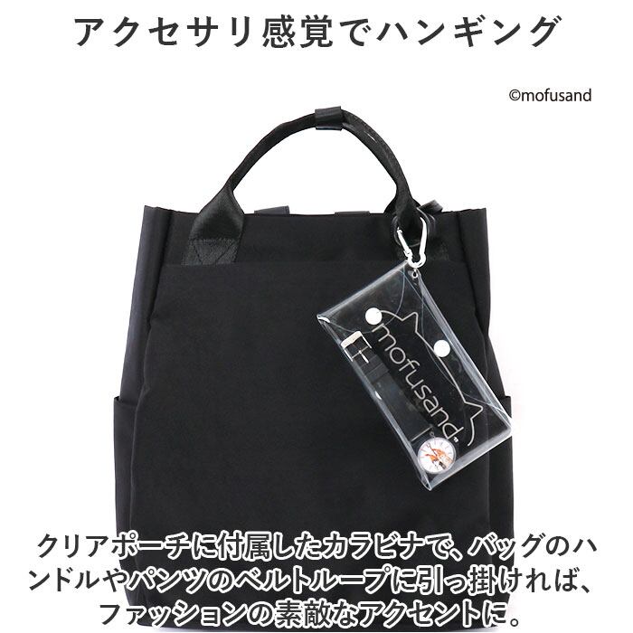 ・クリアポーチに付属したカラビナで、バッグのハンドルやパンツのベルトループに引っ掛ければ、ファッションの素敵なアクセントに。
