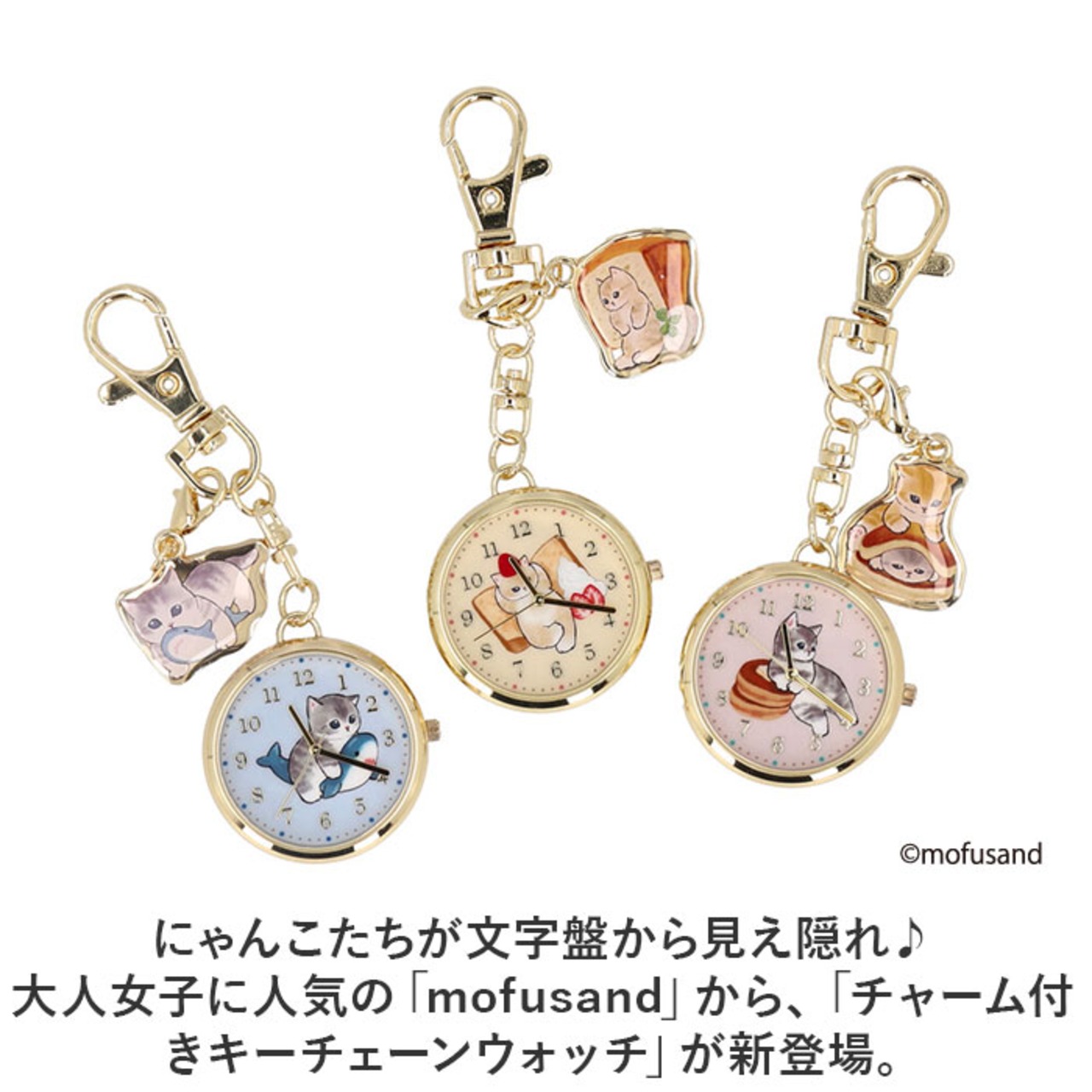 ・にゃんこたちが文字盤から見え隠れ♪大人女子に人気の「mofusand」から、「チャーム付きキーチェーンウォッチ」が新登場。
