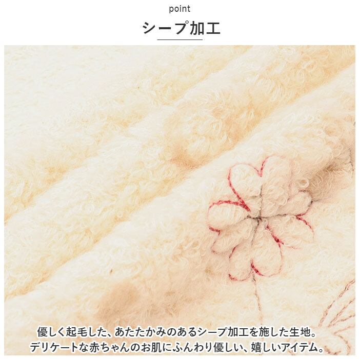 ・優しく起毛した、あたたかみのあるシープ加工を施した生地。デリケートな赤ちゃんのお肌にふんわり優しい、嬉しいアイテム。