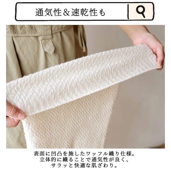 ・表面に凹凸を施したワッフル織り仕様。立体的に織ることで通気性が良く、サラッと快適な肌ざわり。