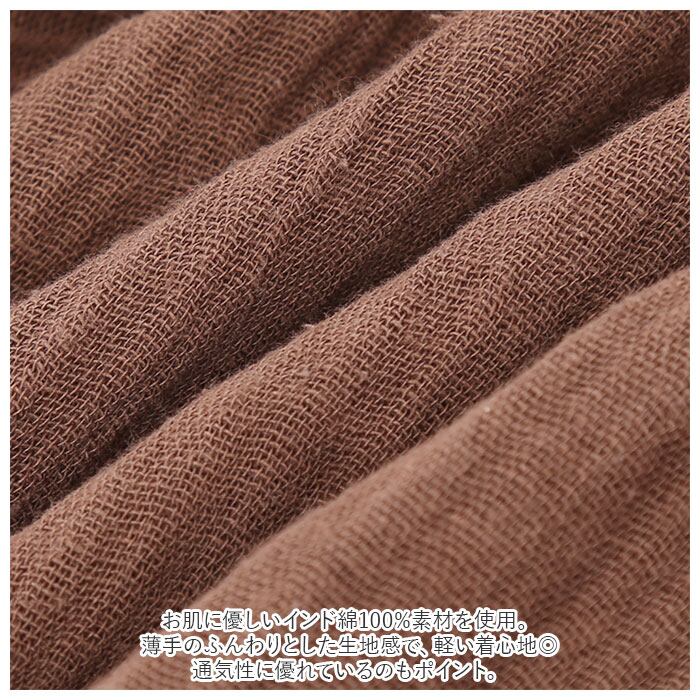 ・お肌に優しいインド綿100%素材を使用。薄手のふんわりとした生地感で、軽い着心地◎