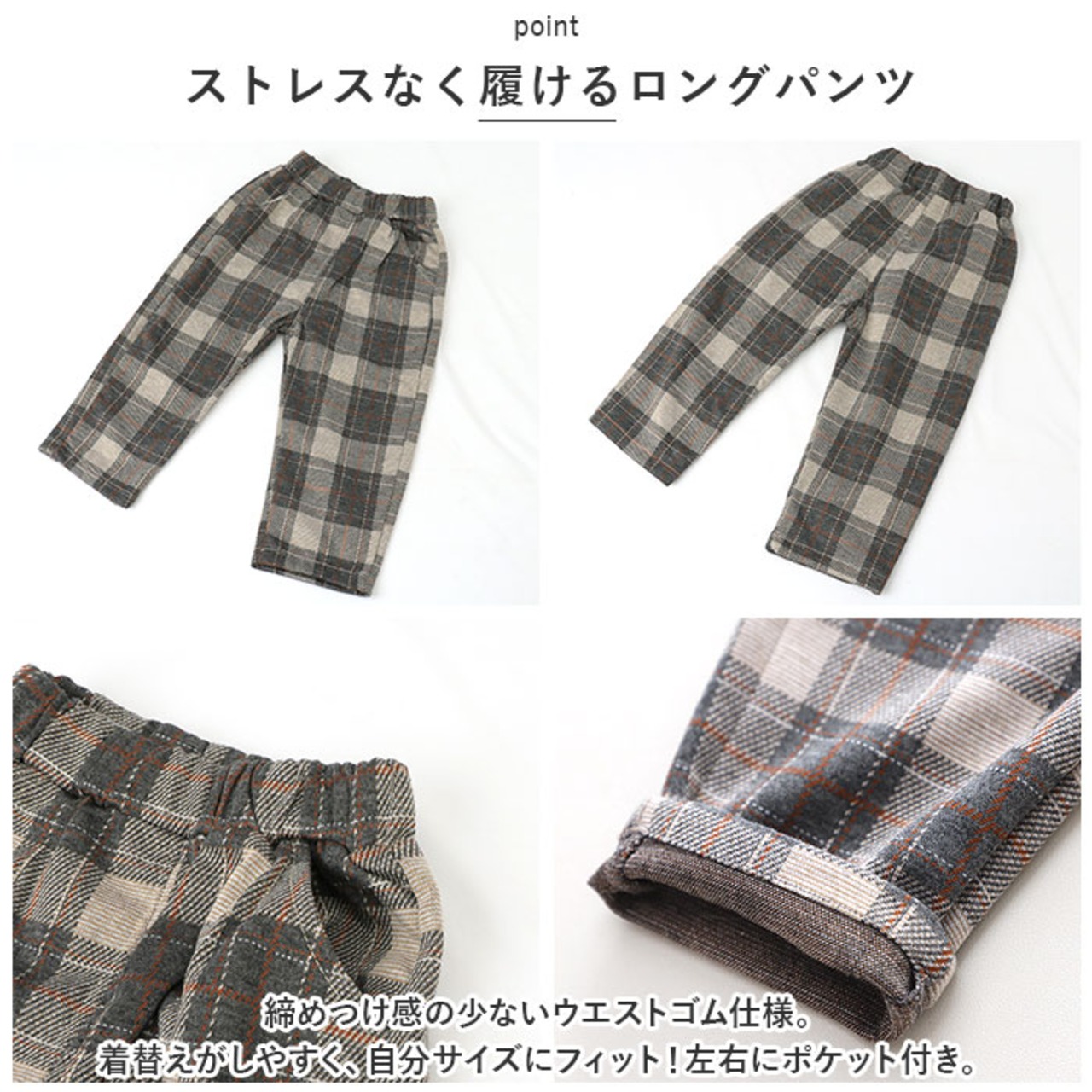 ・締めつけ感の少ないウエストゴム仕様。着替えがしやすく、自分サイズにフィット!左右にポケット付き。