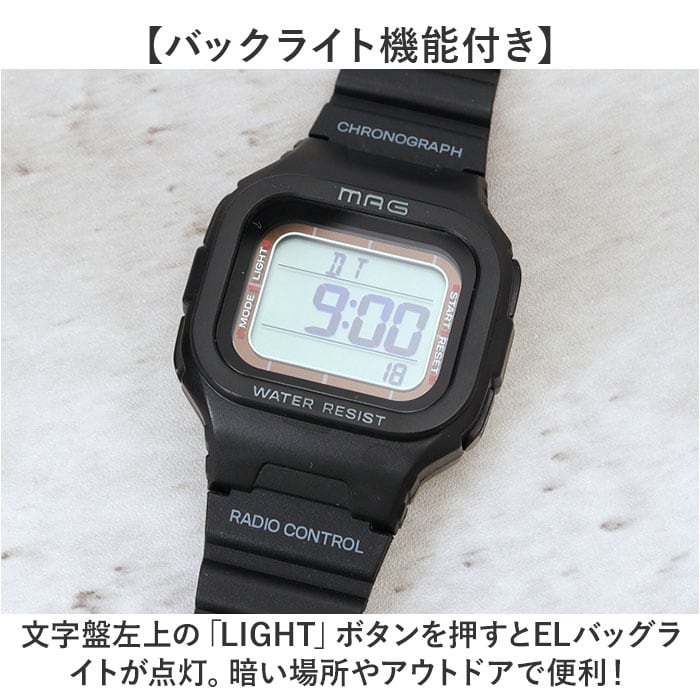 ・文字盤左上の「LIGHT」ボタンを押すとELバッグライトが点灯。暗い場所やアウトドアで便利!