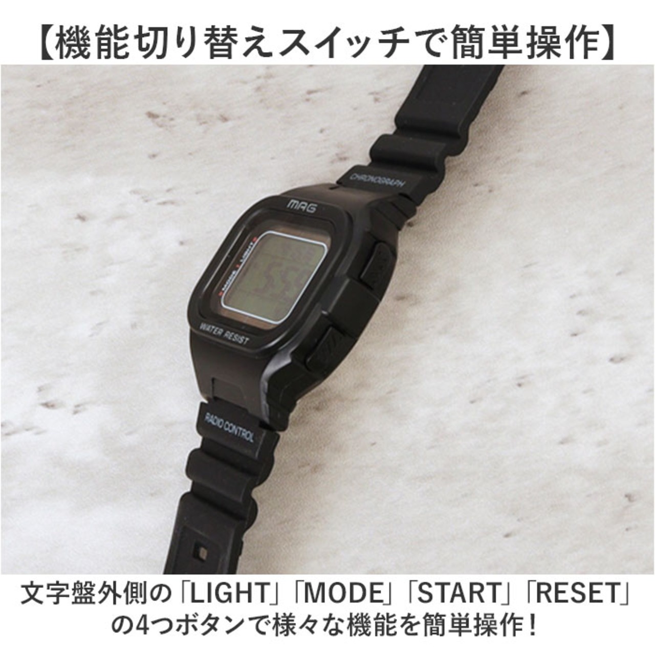 ・文字盤外側の「LIGHT」「MODE」「START」「RESET」の4つボタンで様々な機能を簡単操作!