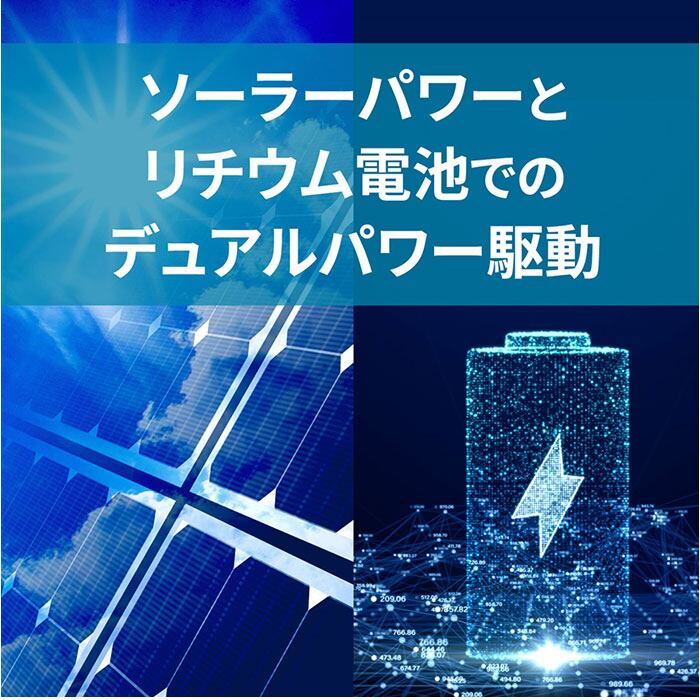 ・日光や照明の光で電池の消費が抑えられる「ソーラー×リチウム電池」のデュアルパワー駆動式。